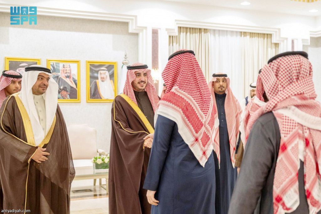 صورة التقطت أمس لفيصل بن نواف، أمير الجوف، أثناء استقبال إدارة العروبة (واس)