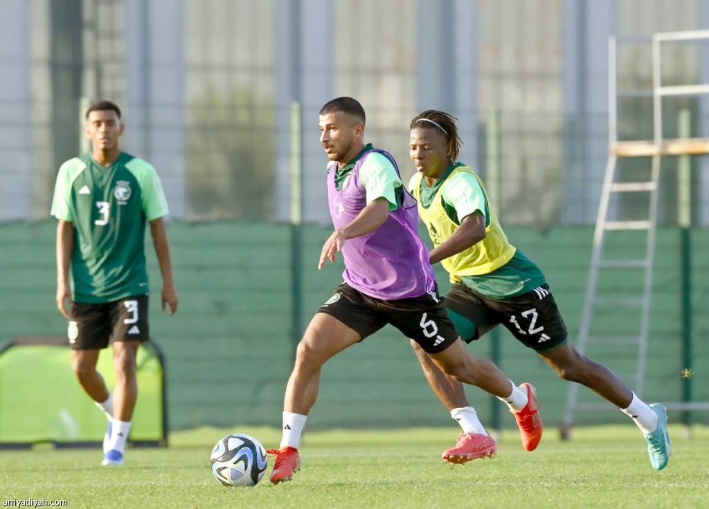 صورة التقطت أمس الأول لباسل السياري، لاعب المنتخب السعودي تحت 23 عامًا، وخلفه إسلام هوساوي ومبارك الراجح خلال المناورة التي فرضها المدرب سعد الشهري (المركز الإعلامي ـ اتحاد القدم)