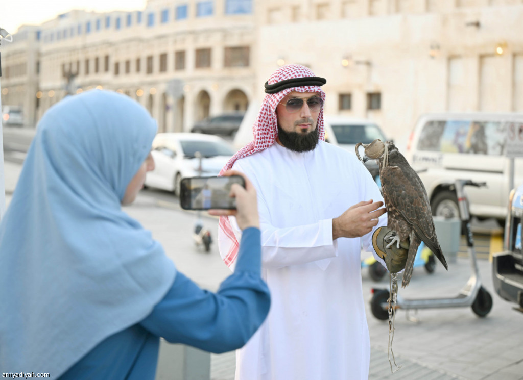 صورة التقطت أمس لمشجع آسيوي يحمل صقرًا ويرتدي الثوب والشماغ الخليجي في سوق واقف خلال حضوره وعائلته بطولة كأس آسيا تصوير: بشير صالح