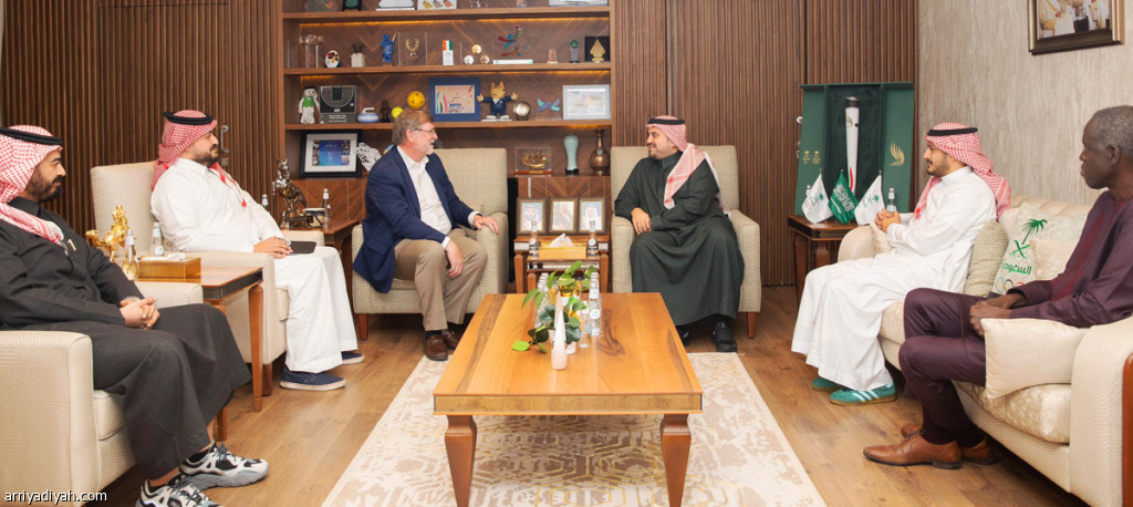 صورة التقطت أمس لفهد بن جلوي خلال اجتماعه مع ببياو ويلينج، رئيس الاتحاد الدولي للكيرلينج(المركز الإعلامي ـ الأولمبية السعودية)