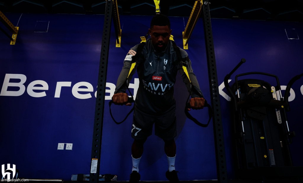 صورة التقطت الخميس للبرازيلي مالكوم فيليب، لاعب فريق الهلال الأول لكرة القدم يؤدي تدريبات التقوية في صالة الاعداد البدني. « المركز الإعلامي ـ الهلال»