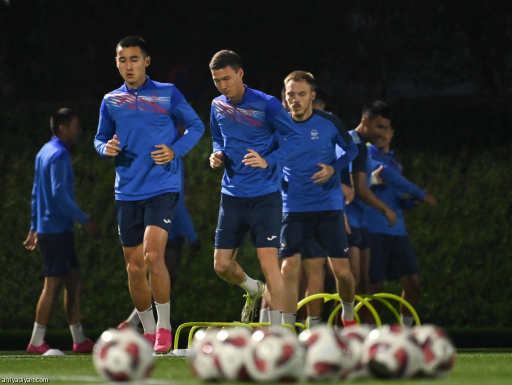 لاعبو المنتخب القرغيزي الأول لكرة القدم خلال التدريبات قبل مواجهة الأخضر تصوير: علي خمج