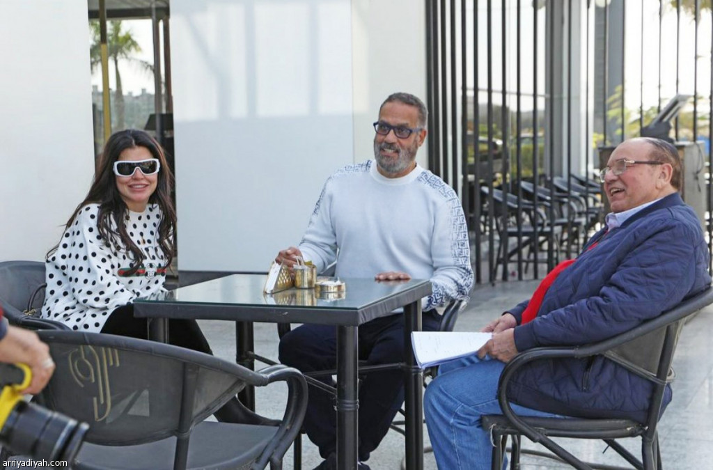 المخرج مجدي أبو عميرة والمنتج جمال العدل والفنانة جومانة مراد، الأحد، في كواليس تصوير مسلسل عتبات البهجة (إنستجرام شركة العدل جروب)
