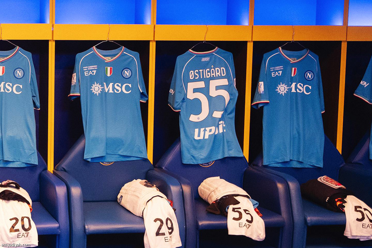 قمصان لاعبي فريق نابولي في غرفة الملابس بملعب الأول بارك قبيل انطلاق المباراة