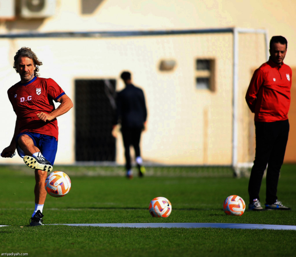 الأورجواني دانيال كارينيو مدرب فريق الحزم الأول لكرة القدم يسدد الكرة في التدريب الصباحي الذي فرضة على اللاعبين في النادي «المركز الاعلامي ـ الحزم»