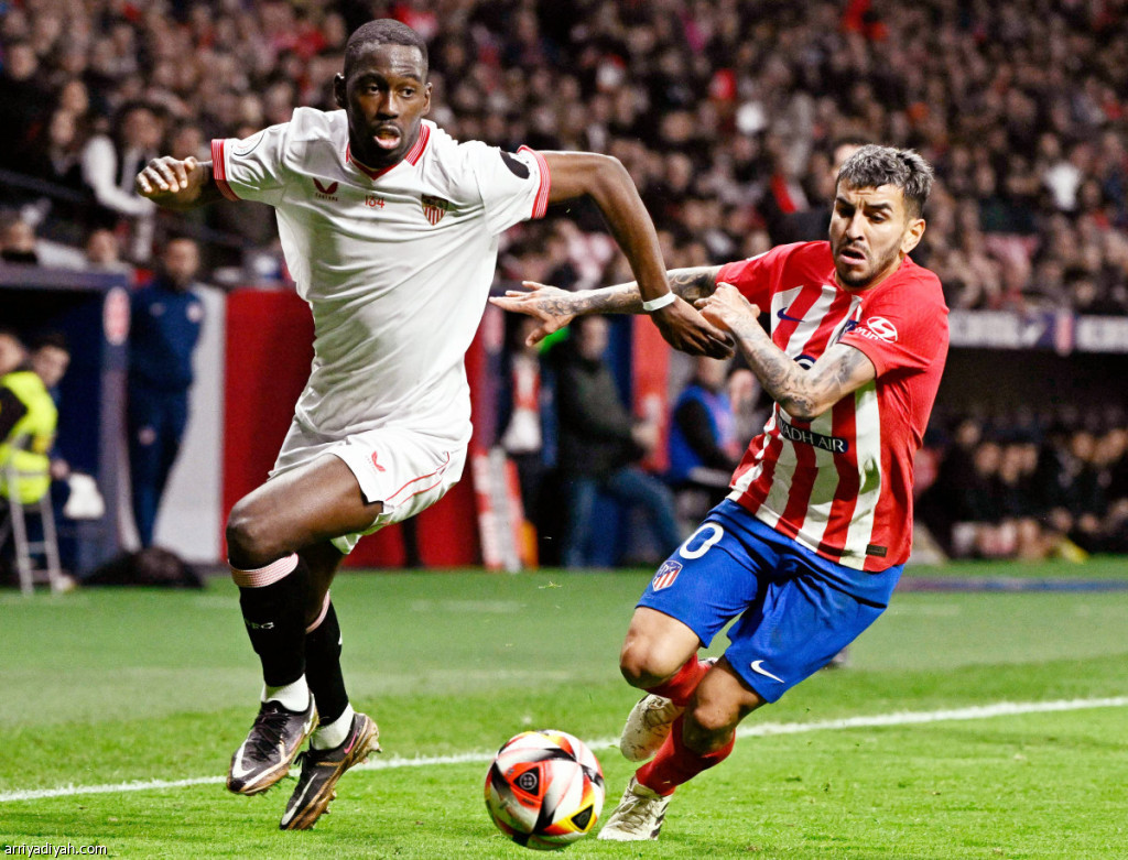 بوبكاري سوماري لاعب خط وسط إشبيلية يتنافس على الكرة، الأربعاء، مع أنخيل كوريا مهاجم أتلتيكو مدريد خلال مباراتهم في ربع نهائي الكأس (الفرنسية)