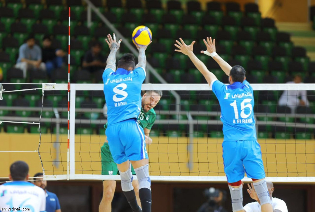لاعبان من الهلال يشكلان حائط صد لتسديدة أهلاوية خلال مباراة الجولة الـ11 التي كسبها الأزرق 3ـ1 (المركز الإعلامي ـ اتحاد الطائرة)