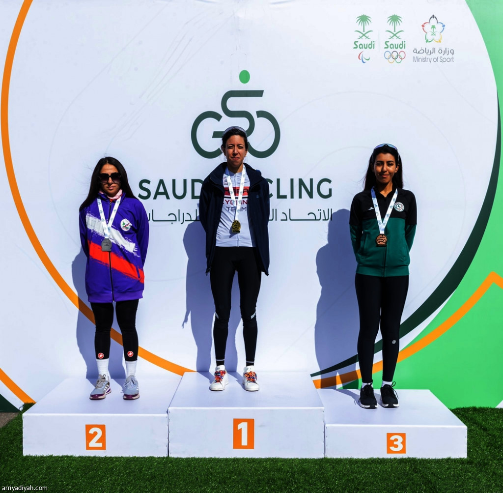 جانب من تتويج اصحاب المراكز الثلاث الاولى في دوري الاتحاد السعودي للدراجات فئة السيدات ( المركز الاعلامي_اتحاد الدراجات )