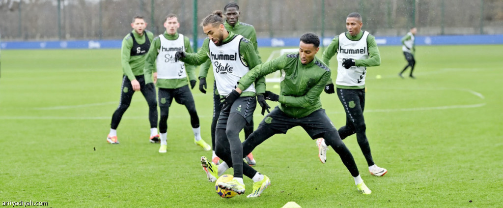 المهاجم البرتغالي يوسف تشيرميتي يحاول استخلاص الكرة من زميله دومينيك كالفيرت ليوين خلال حصةٍ تدريبيةٍ لإيفرتون، الجمعة (المركز الإعلامي ـ إيفرتون)
