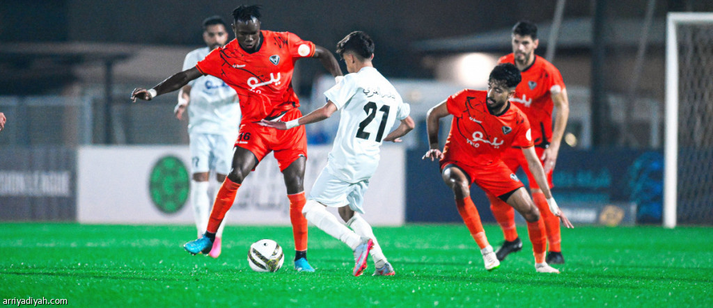 المالي داودا تروي، لاعب الصفا، يحاول لعب الكرة وسط مضايقة من بندر العنزي، لاعب الجندل (المركز الإعلامي ـ دوري يلو)