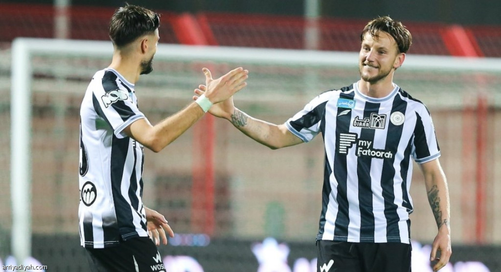 الكرواتي إيفان راكيتيتش، لاعب فريق الشباب الأول لكرة القدم، يحتفل بهدفه مع زميله البلجيكي يانيك كاراسكو (المركز الإعلامي ـ الشباب)