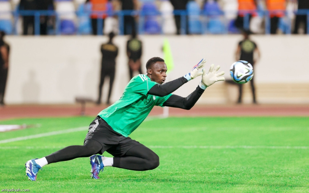 إدوارد ميندي، حارس مرمى الأهلي، يلتقط كرة مسددة عليه خلال عمليات الإحماء قبل مواجهة الأخدود، الجمعة، في الجولة الـ 20 من دوري روشن السعودي (المركز الإعلامي ـ الأهلي)