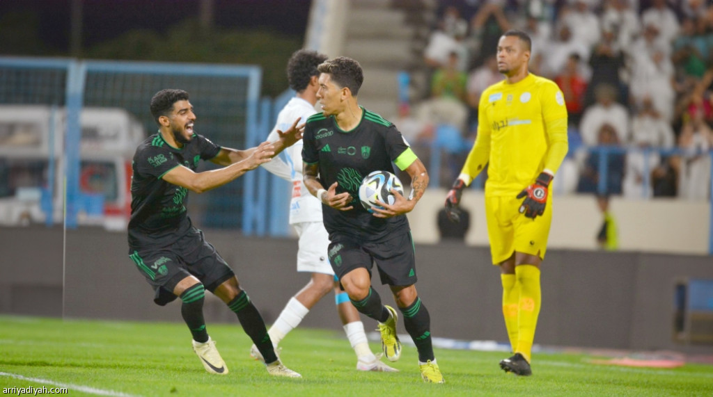 البرازيلي روبرتو فيرمينو، مهاجم فريق الأهلي الأول لكرة القدم، يحمل الكرة بعد تسجيله من علامة الجزاء أمام الأخدود، سعيًا لاستئناف اللعب سريعًا خلال مواجهة الطرفين، الجمعة، ضمن الجولة الـ 20 من دوري روشن السعودي (المركز الإعلامي ـ دوري روشن)