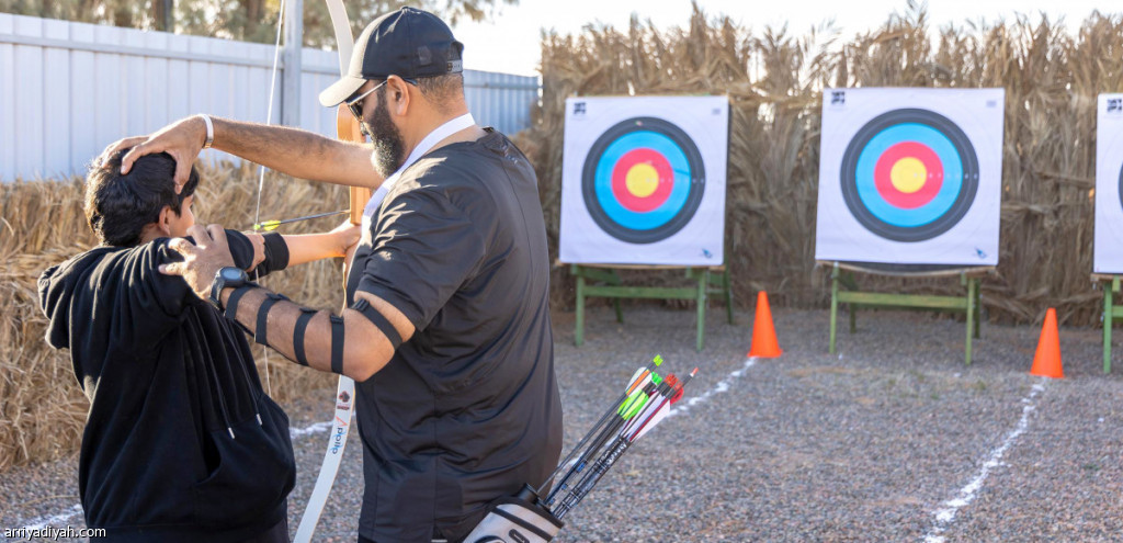 مدرب سهام يوجه أحد المشاركين في فعاليات اليوم العائلي الرياضي في لعبة السهام (واس)