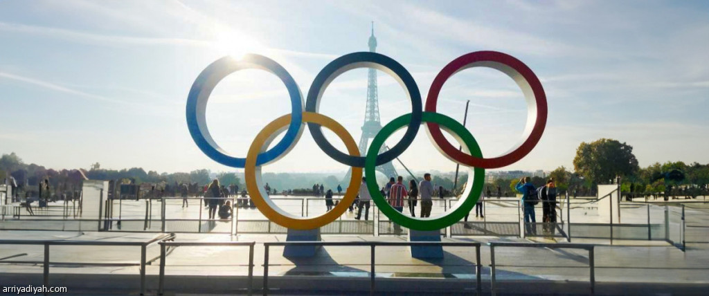 مُجسم شعار دورة الألعاب الأولمبية أمام برج إيفل في باريس العاصمة الفرنسية (أرشيفية)