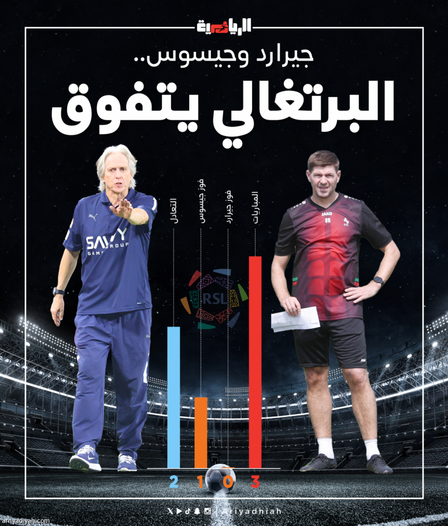 يتجدَّد اللقاء بين الإنجليزي ستيفن جيرارد، مدرب فريق الاتفاق الأول لكرة القدم، والبرتغالي جورجي جيسوس، مدرب الهلال، للمرة الرابعة عندما يقودان فريقهما، اليوم الإثنين، على ملعب نادي الاتفاق ضمن «جولة يوم التأسيس» الـ 21 من دوري روشن السعودي.