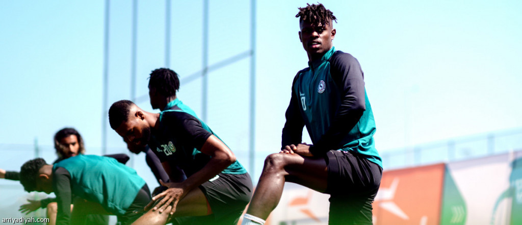 هارون كمارا لاعب فريق الاتفاق الأول لكرة القدم وعدد من زملائه يؤدون تمارين لياقية اليوم الثلاثاء (المركز الإعلامي ـ الاتفاق)
