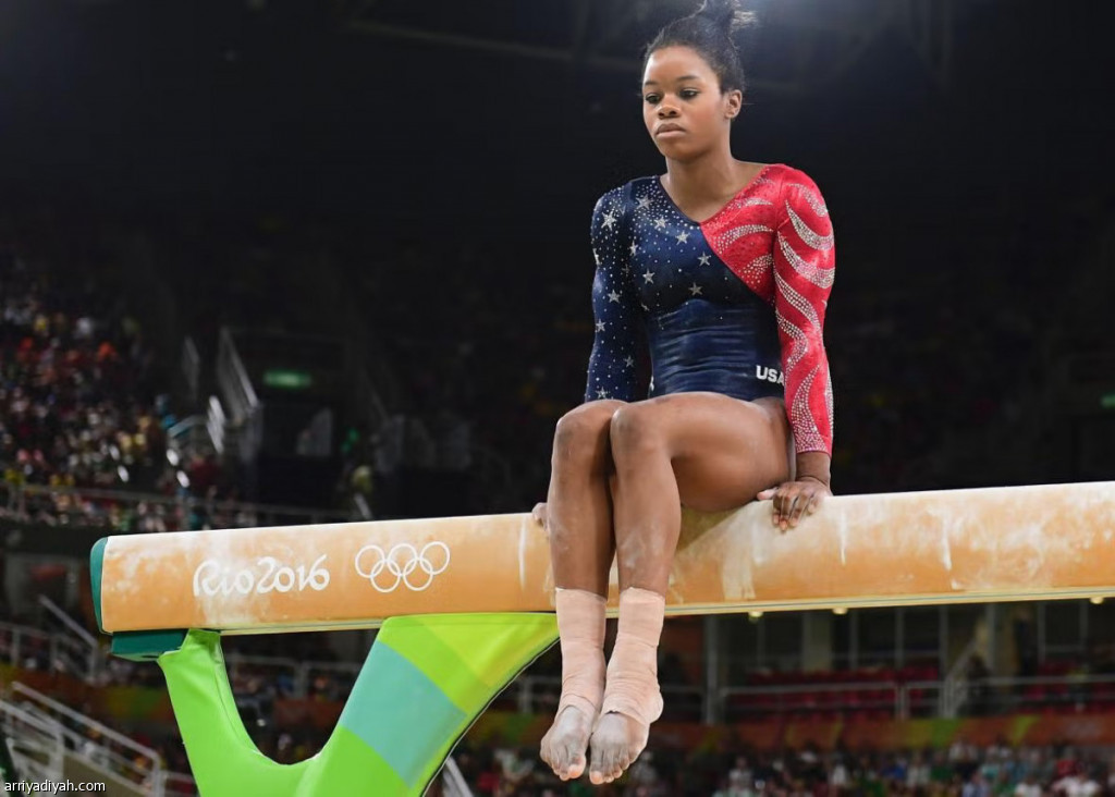 لأمريكية جابي دوجلاس، لاعبة الجمباز، أثناء مشاركتها في أولمبياد ريو دي جانيرو 2016 في البرازيل (أرشيفية)