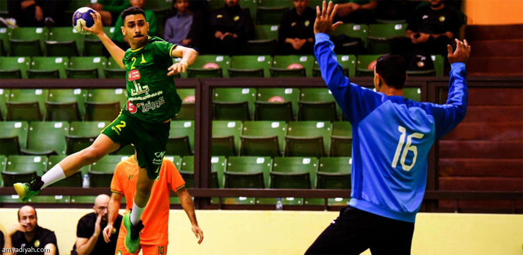 علي المسكين، لاعب فريق الخليج الأول لكرة اليد، يسدد الكرة تجاه مرمى الروضة ضمن مواجهات ربع النهائي (المركز الإعلامي ـ اتحاد اليد)