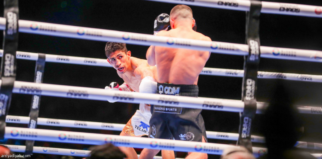 المكسيكي راي فارجاس يسدد لكمة إلى الإنجليزي نيك بوك خلال نزالهما الجمعة تصوير: عبد العزيز النومان