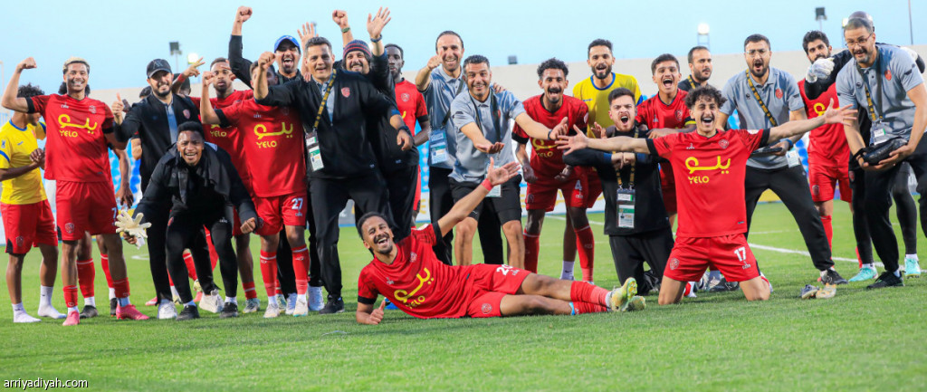 جانب من فرحة لاعبي فريق القيصومة الأول لكرة القدم بعد الفوز على البكيرية بهدف دون مقابل في دوري يلو (المركز الإعلامي - دوري يلو)