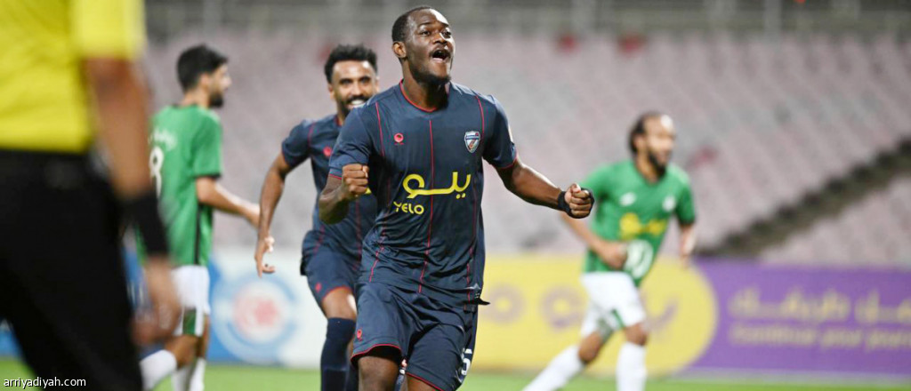 مدوين مندام لاعب فريق جدة الأول لكرة القدم يحتفل بتسجيل هدف الفوز لفريقه (المركز الإعلامي ـ دوري يلو)