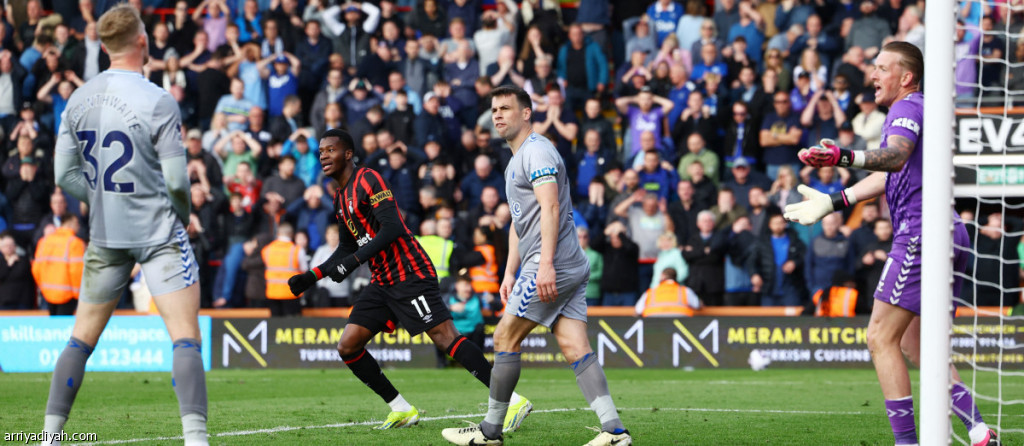 البوركيني دانجو واتارا، جناح بورنموث، يحتفل بعد تسجيل الإيرلندي شيموس كولمان، مدافع إيفرتون، الهدف الثاني في شباك فريقه (رويترز)