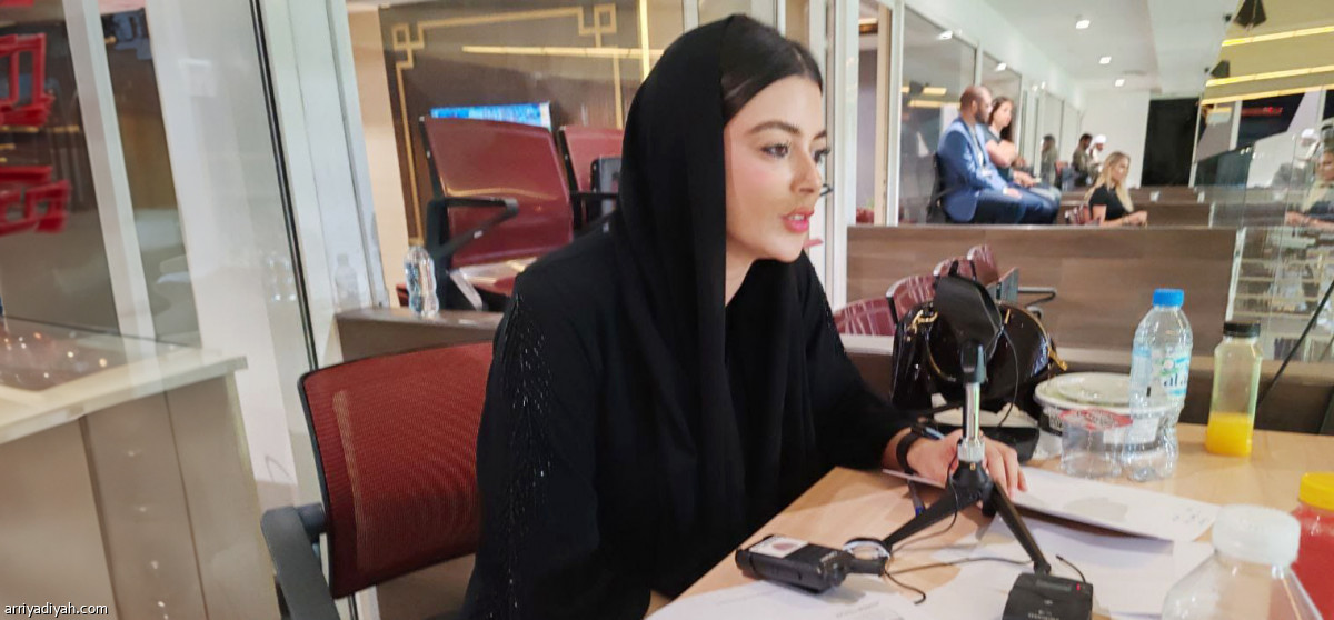 إيمان الأنصاري، المذيعة الداخلية، أثناء تأدية وظيفتها في ملعب نادي الوحدة الإماراتي، خلال مباراة الاتحاد والوحدة، الإثنين، في نصف نهائي كأس الدرعية للسوبر السعودي (صورة خاصة بـ «الرياضية»)