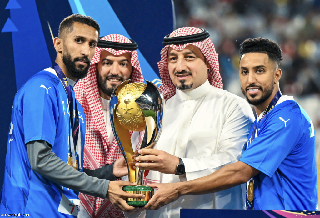 سالم الدوسري وسلمان الفرج، قائدا فريق الهلال الأول لكرة القدم، يتسّلمان كأس الدرعية للسوبر السعودي، الخميس، من ياسر المسحل، رئيس اتحاد الكرة، بحضور فهد بن نافل، رئيس النادي تصوير: عبد العزيز النومان
