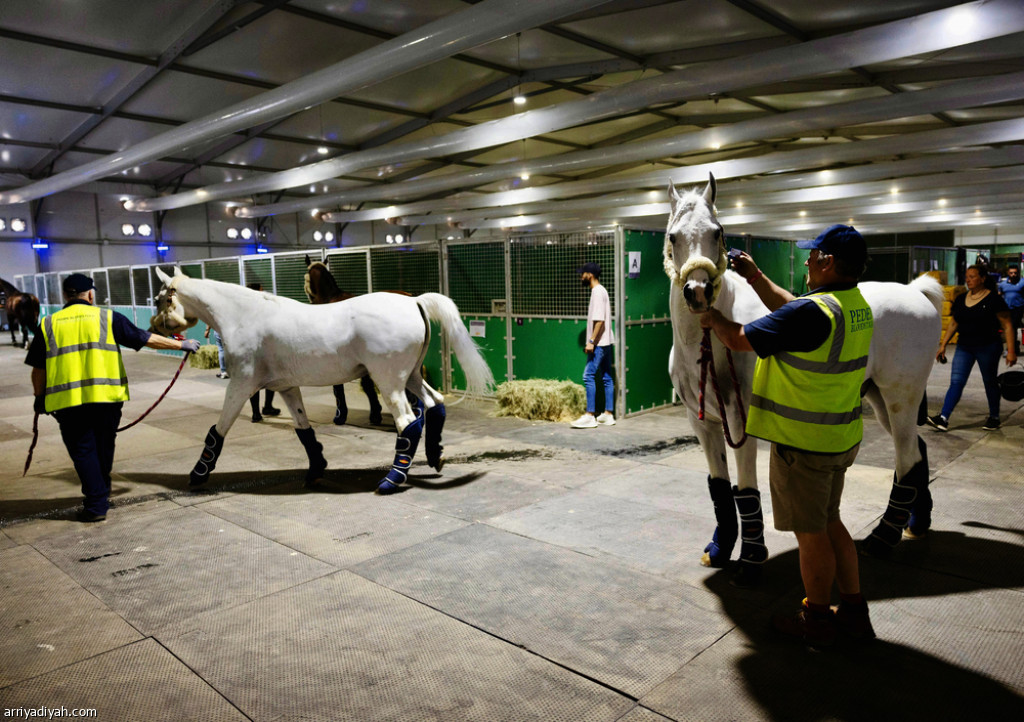 ونقلت الخيول المشاركة عبر شاحنات مخصصة إلى الإسطبلات الخاصة بها في مقر البطولة في مركز الرياض الدولي للمعارض والمؤتمرات.