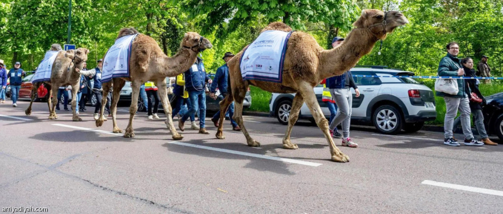 إبلٌ خلال مشاركتها في مسيرة الإبل التي نُظِّمت، السبت، في باريس (واس)