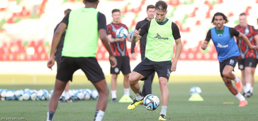 مجموعة من لاعبي فريق الاتفاق الأول لكرة القدم خلال الحصة التدريبية، الخميس (المركز الإعلامي ـ الاتفاق)