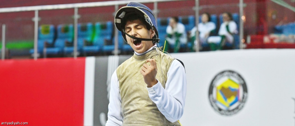 فرحة أحد لاعبي المنتخب السعودي للمبارزة بعد الحصول على الميدالية الذهبية في دورة الألعاب الخليجية الأولى للشباب (المركز الإعلامي ـ الأولمبية السعودية)