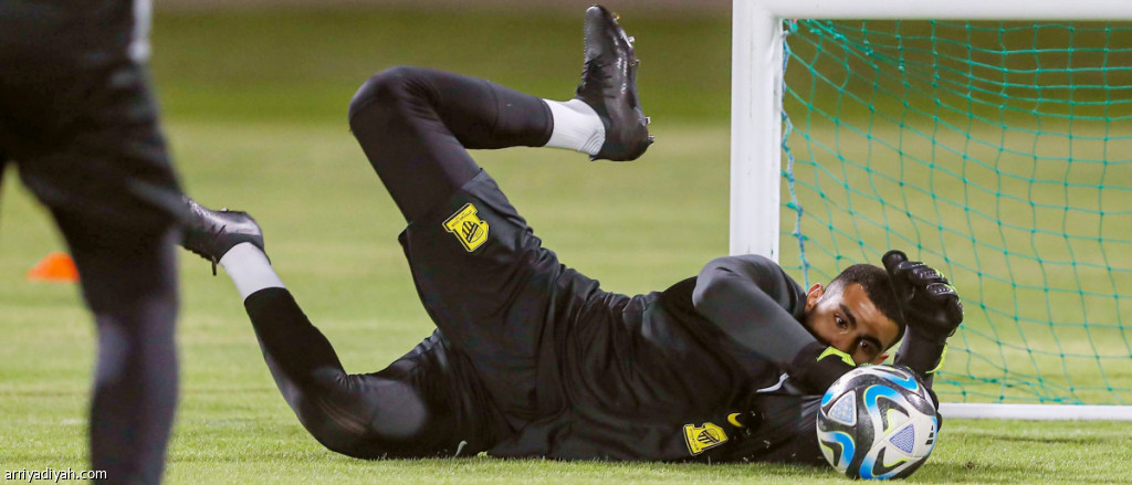 محمد المحاسنة، حارس فريق الاتحاد الأول لكرة القدم، خلال الحصة التدريبية، الأربعاء (المركز الإعلامي ـ الاتحاد)