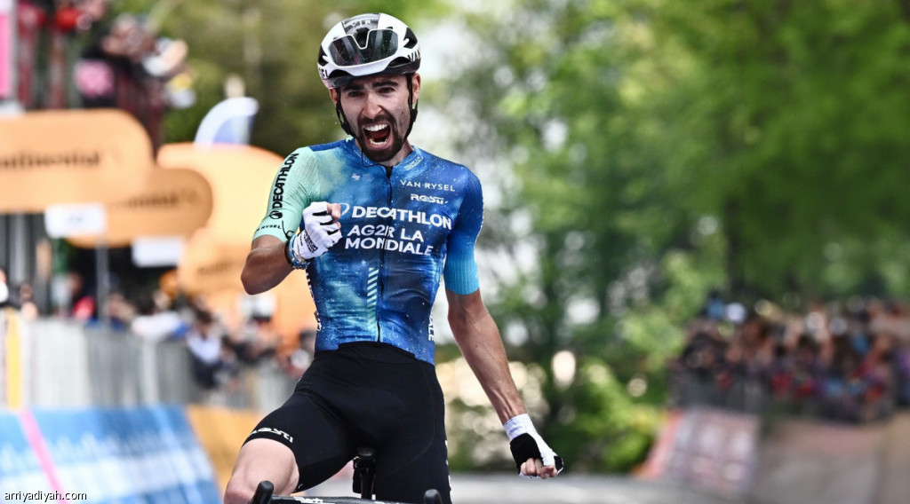 المتسابق الفرنسي فالنتين باريت بينتر يحتفل بعد عبور خط النهاية والفوز بالمرحلة العاشرة من سباق Giro d'Italia 2024 رقم 107، الثلاثاء (الأوروبية)