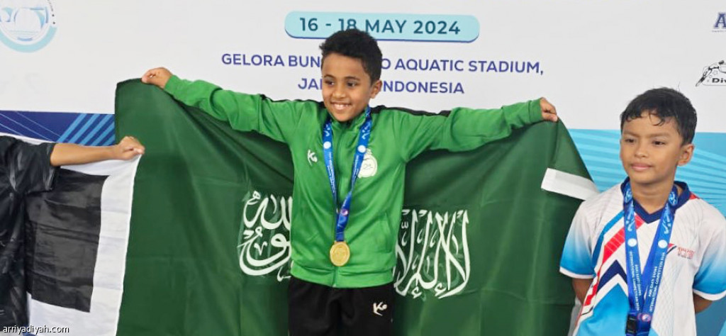 وسام نعيم، لاعب المنتخب السعودي للغطس «فئة البراعم»، أثناء تتويجه بالميدالية الذهبية في بطولة جاكرتا الدولية (المركز الإعلامي ـ اتحاد السباحة)