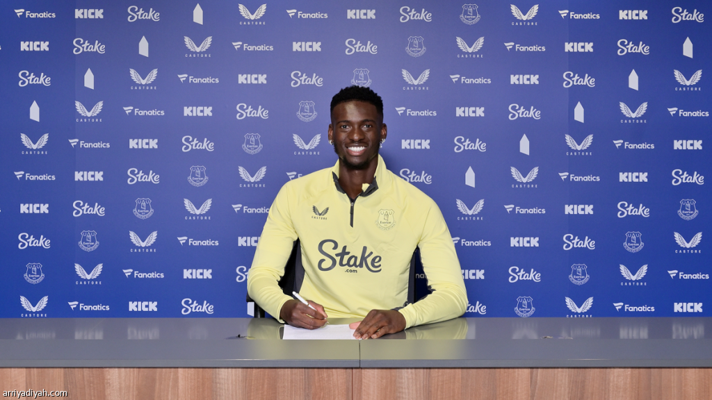 تيم إيرويجبونام أثناء توقيعه مع نادي إيفرتون الإنجليزي، السبت (المركز الإعلامي ـ إيفرتون الإنجليزي)