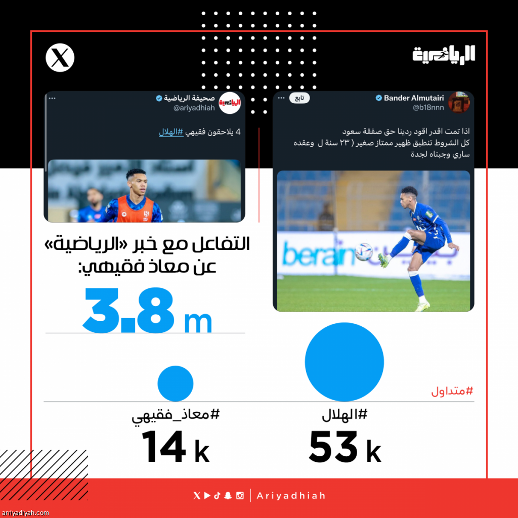 وبلغ التفاعل مع خبر الزميل خالد الرشيد «@k7aled_otb» أكثر من 3.8 مليون بعد 19 ساعة من نشره عبر منصة «إكس».