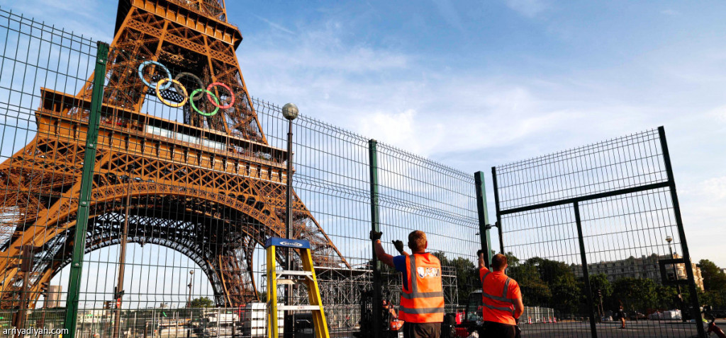 عمال يضعون الجمعة حواجز بالقرب من برج إيفل المزين بالحلقات الأولمبية لدورة الألعاب الأولمبية المقبلة باريس 2024 (الفرنسية)