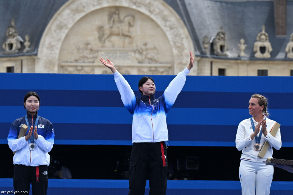 الكورية الجنوبية ليم شي هون، الفائزة بالميدالية الذهبية في منافسات فردي الرماية للسيدات في الأولمبياد، السبت، تتوسط مواطنتها نام سو هيون، صاحبة الفضية، والفرنسية ليزا باربلان الحاصلة على الميدالية البرونزية (الفرنسية)