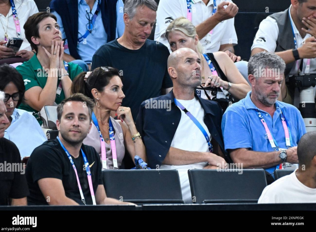 الفرنسي زين الدين زيدان، نجم كرة القدم المعتزل، وزوجته فيرونيك، أثناء حضورهما إحدى منافسات أولمبياد باريس 2024 (موقع alamy)