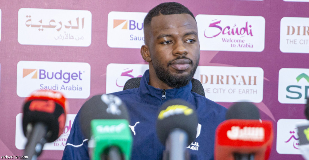حسان تمبكتي، مدافع فريق الهلال الأول لكرة القدم، خلال حديثه لوسائل الإعلام في المؤتمر الصحافي، الإثنين تصوير: سعد الدوسري