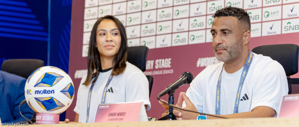 البرازيلية كاثلين سوزا، لاعبة فريق النصر للسيدات، ومدربها البرتغالي ساندرو مينديز، يتحدثان السبت، قبل انطلاق مشوار الأصفر في تصفيات دوري أبطال آسيا (المركز الإعلامي ـ دوري أبطال آسيا)