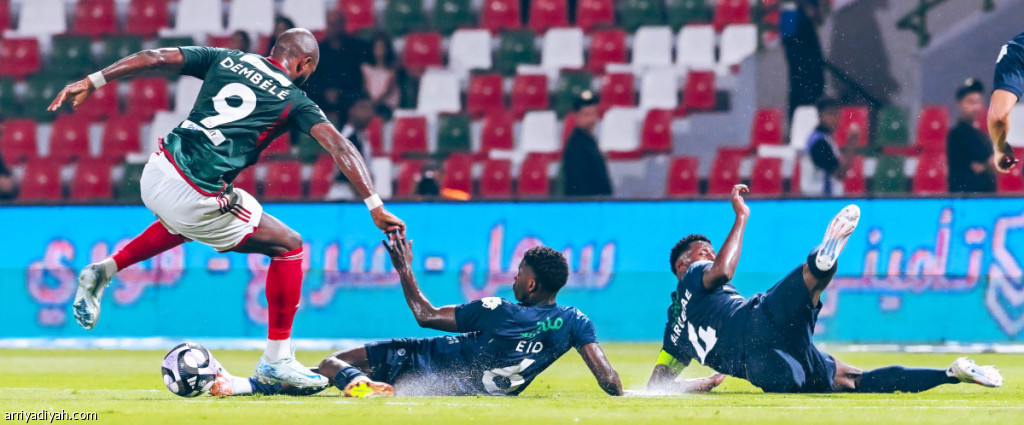 الفرنسي موسى ديمبيلي مهاجم فريق الاتفاق يحاول تخطي سعيد الربيعي وعيد المولد لاعبي الأخدود في المباراة التي انتهى شوطها الأول بالتعادل السلبي بين الفريقين (المركز الإعلامي ـ رابطة دوري المحترفين)