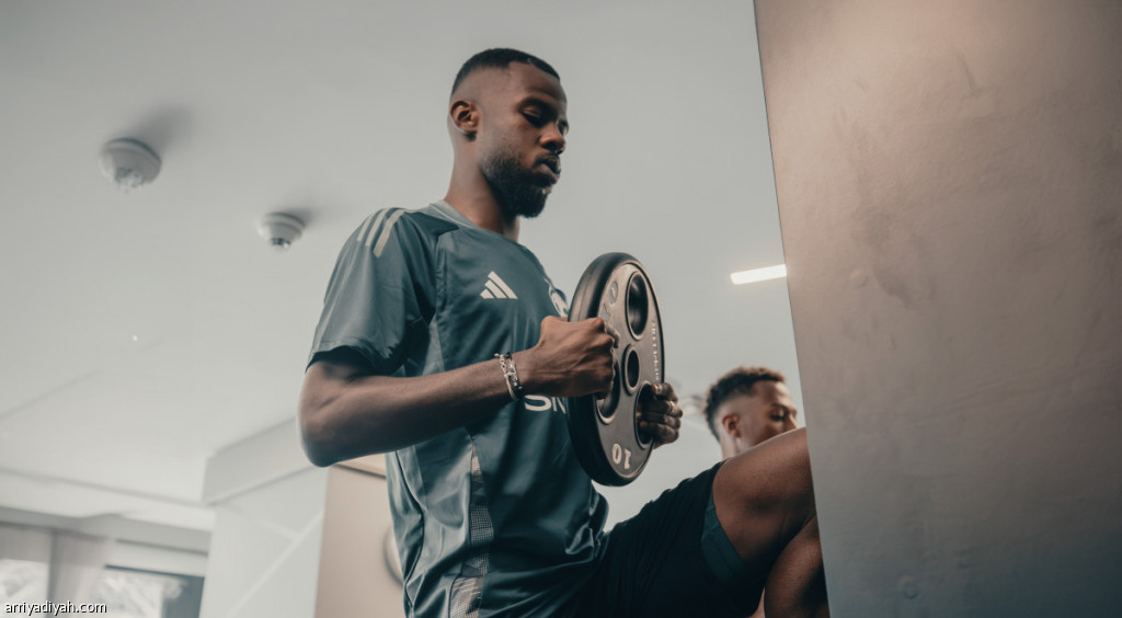 حسان تمبكتي، مدافع المنتخب السعودي الأول لكرة القدم، يحمل ثقلًا دائريًا لتقوية العضلات، السبت، خلال الحصة التدريبية الصباحية، في مقر سكن الأخضر (المركز الإعلامي ـ المنتخب السعودي)