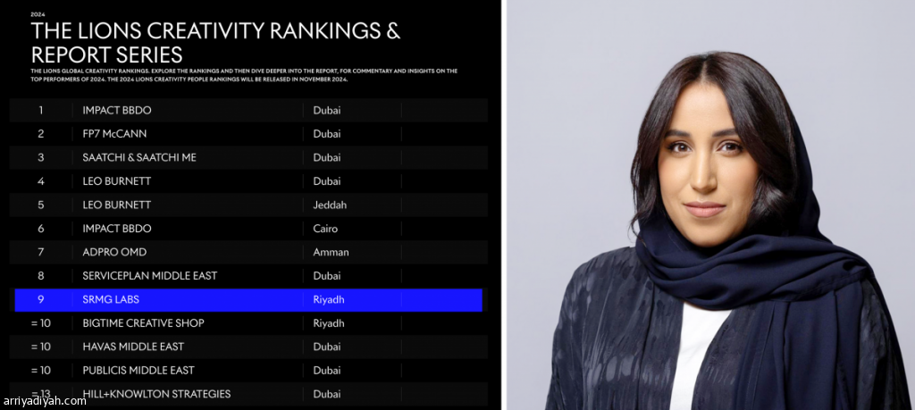حلّت «SRMG Labs»، شركة الخدمات الإبداعية والإعلانية، في المركز الأول بين الشركات السعودية، والتاسع على صعيد الشرق الأوسط وشمال إفريقيا في تقرير «ليونز العالمي للإبداع» الصادر حديثًا، والذي يعد معيارًا عالميًا موثوقًا في مجالات الإبداع والتسويق لدى الوكالات والعلامات التجارية.