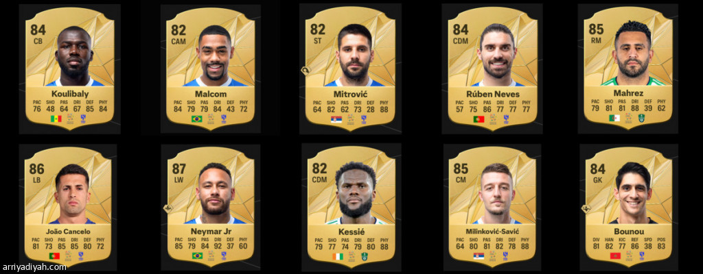 ويتصدر البرازيلي نيمار، لاعب الهلال، هذه القائمة، رغم غيابه عن قائمة فريقه في النصف الأول من الموسم الحالي، إذ يحضر في FC 25 مع تقييم إجمالي مرتفع يصل إلى 87، الأمر الذي يضعه في المركز 52 عالمياً، مع تقييم لافت في المراوغة يصل إلى 94، ويليه البرتغالي جواو كانسيلو، مع تقييم 86، ومركز 72 على الصعيد العالمي في النسخة الجديدة من اللعبة.