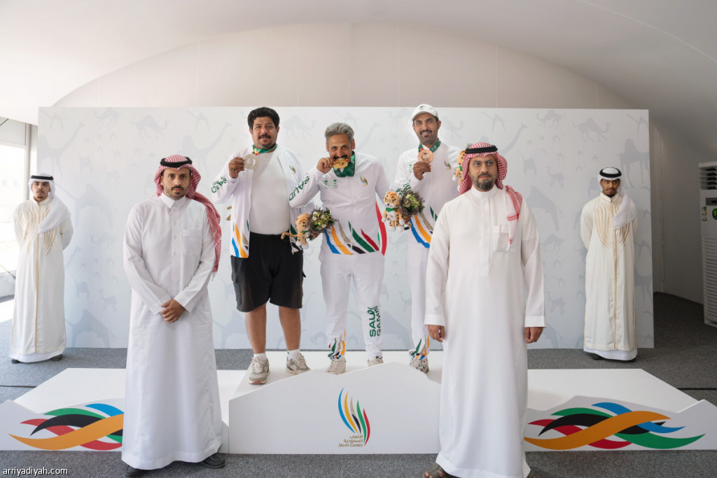جانب من تتويج أصحاب المراكز الأولى في مسابقة الرماية بدورة الألعاب السعودية الثالثة، الأحد (المركز الإعلامي ـ الألعاب السعودية)
