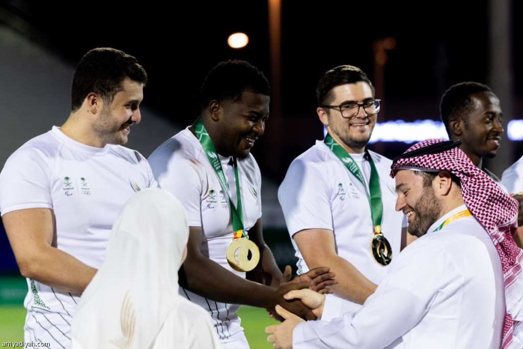 جانبٌ من تتويج الفائزين بالميدالية الذهبية في رياضة الرجبي (المركز الإعلامي - دورة الألعاب السعودية)