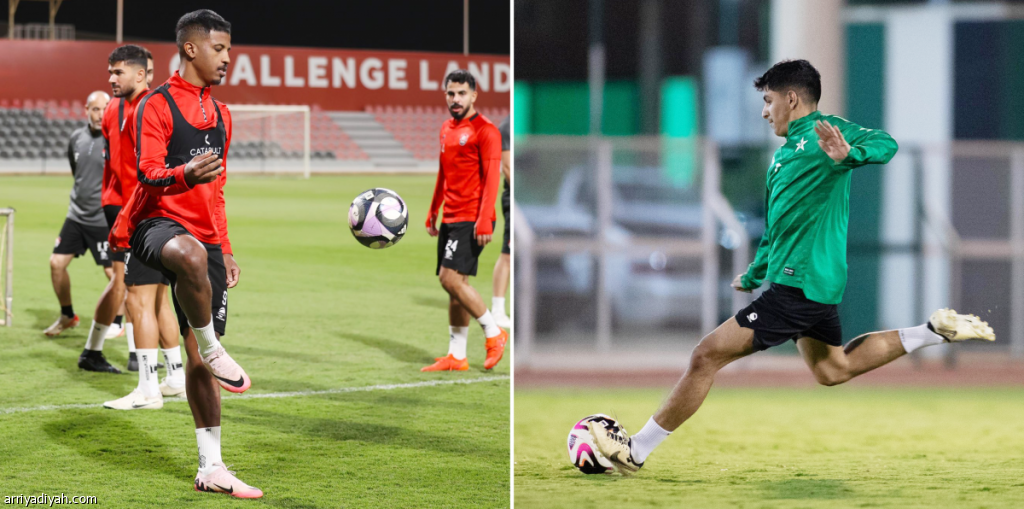 نواف الرشودي لاعب النجمة ورائد الغامدي مهاجم الرائد خلال استعدادات الفريقين للقاء (المركز الإعلامي - النجمة والرائد)